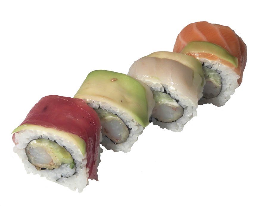 KING RAINBOW ROLL KING RAINBOW ROLL – 25 PLN (4 szt) – 48 PLN (8 szt) (Łosoś/tuńczyk/Butterfish, krewetka/okoń, majonez, krewetka w tempurze, ogórek, avocado)