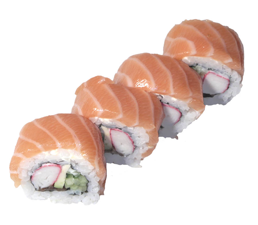 KING SALMON ROLL KING SALMON ROLL – 25 PLN (4 szt) – 48 PLN (8 szt) (łosoś, serek, paluszek krabowy, avocado, ogórek)