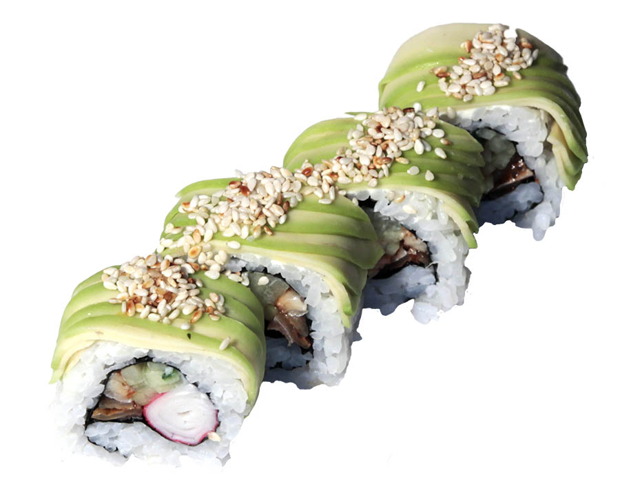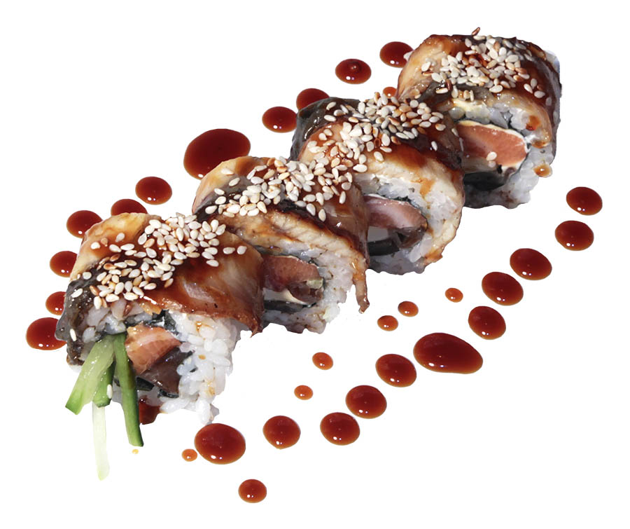 UNAGI DRAGON ROLL UNAGI DRAGON ROLL – 26 PLN (4 szt) – 48 PLN (8 szt) (węgorz, ogórek, avocado, łosoś, kanpyo)