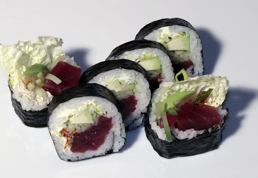 PHILADELPHIA TUNA NA OSTRO – 32 PLN PHILADELPHIA TUNA NA OSTRO (serek, sałata, ogórek, avocado, tuńczyk, sicimi) – 6 sztuk