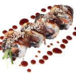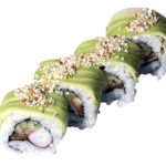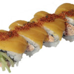 KING RAINBOW ROLL – 25 PLN (4 szt) – 48 PLN (8 szt) (Łosoś/tuńczyk/Butterfish, krewetka/okoń, majonez, krewetka w tempurze, ogórek, avocado)